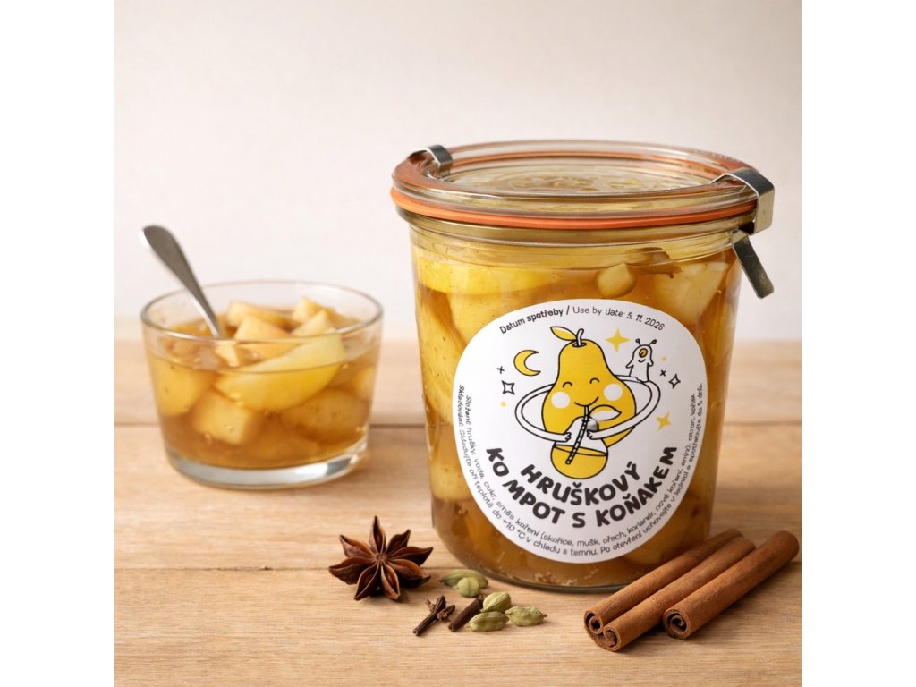 Složení: hrušky, cukr, citron, koření (skořice, muškátový oříšek, koriandr, nové koření, anýz), koňak.