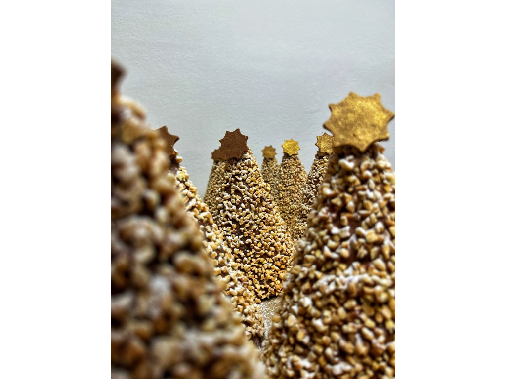 Hořká a mléčná čokoláda tvoří kmen vánočního stromečku, který uvnitř ukrývá kostky arašídového nugátu. Vše je zasněženo praženými arašídy a cukrem.